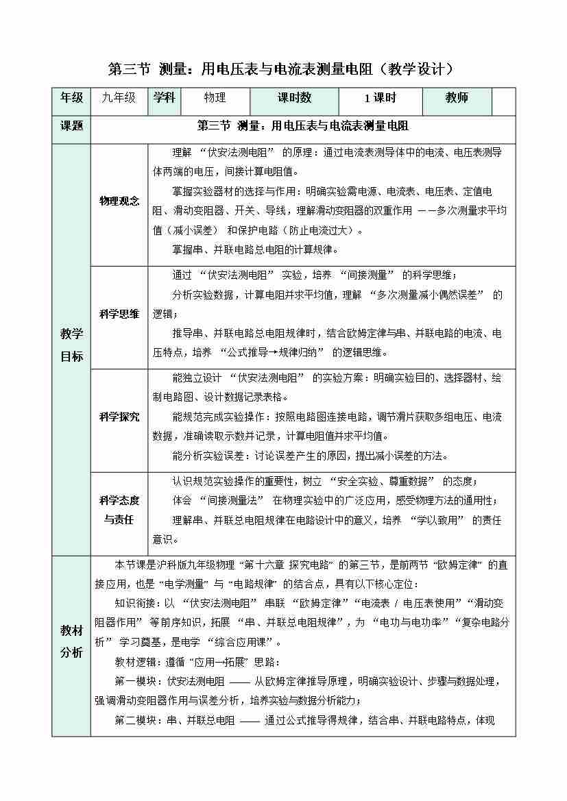 第三节 测量:用电压表和电流表测量电阻(表格式教学设计)物理沪科版2024九年级全一册