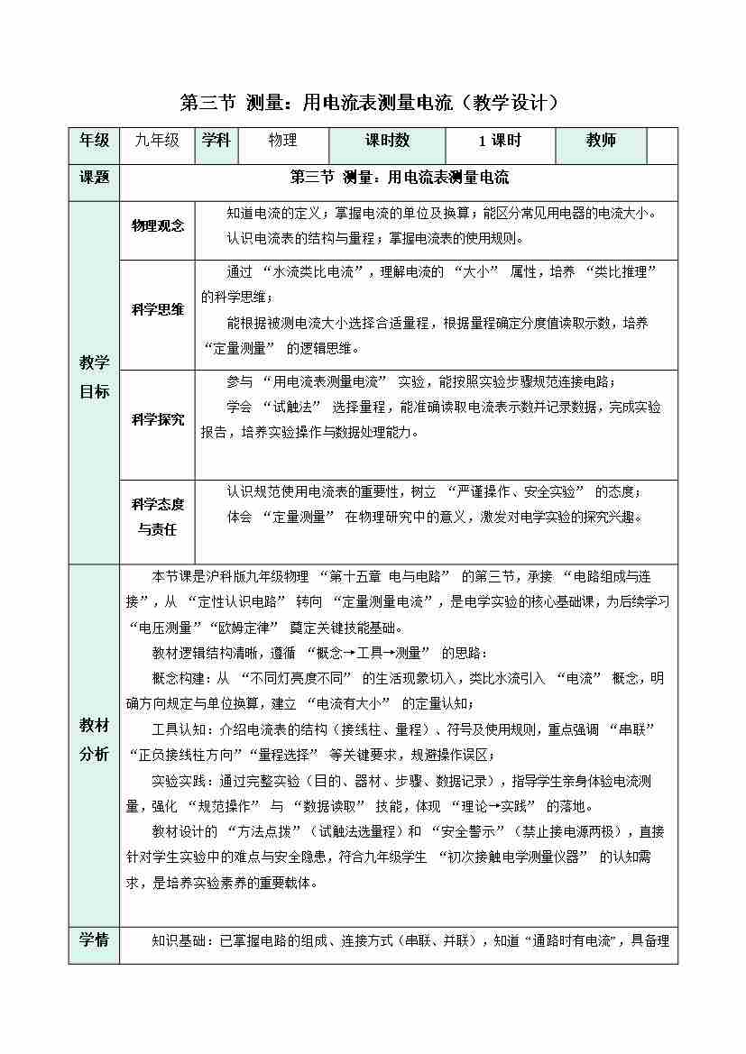 第三节 测量:用电流表测量电流(教学设计)物理沪科版2024九年级全一册