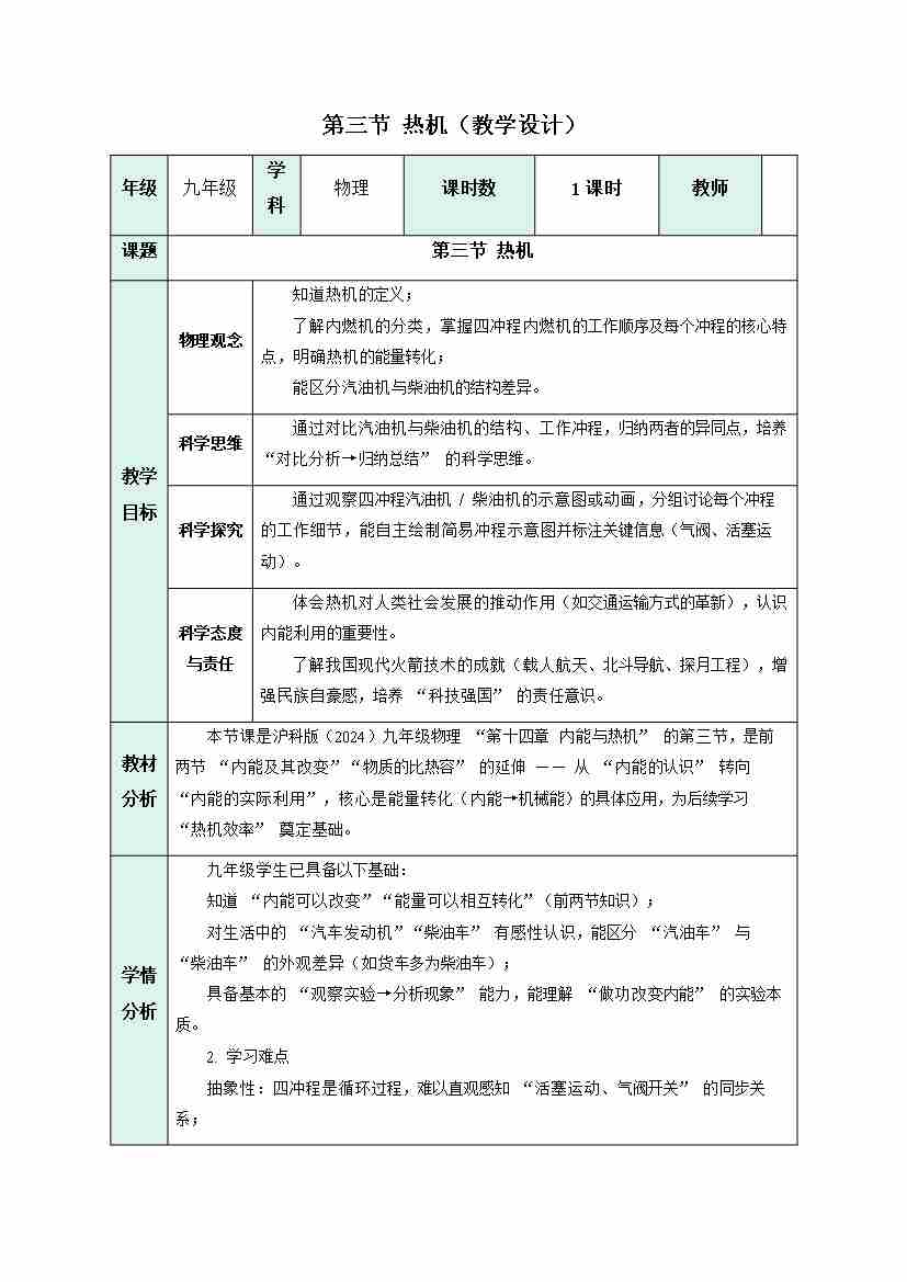 第三节 热机(教学设计)物理沪科版2024九年级全一册