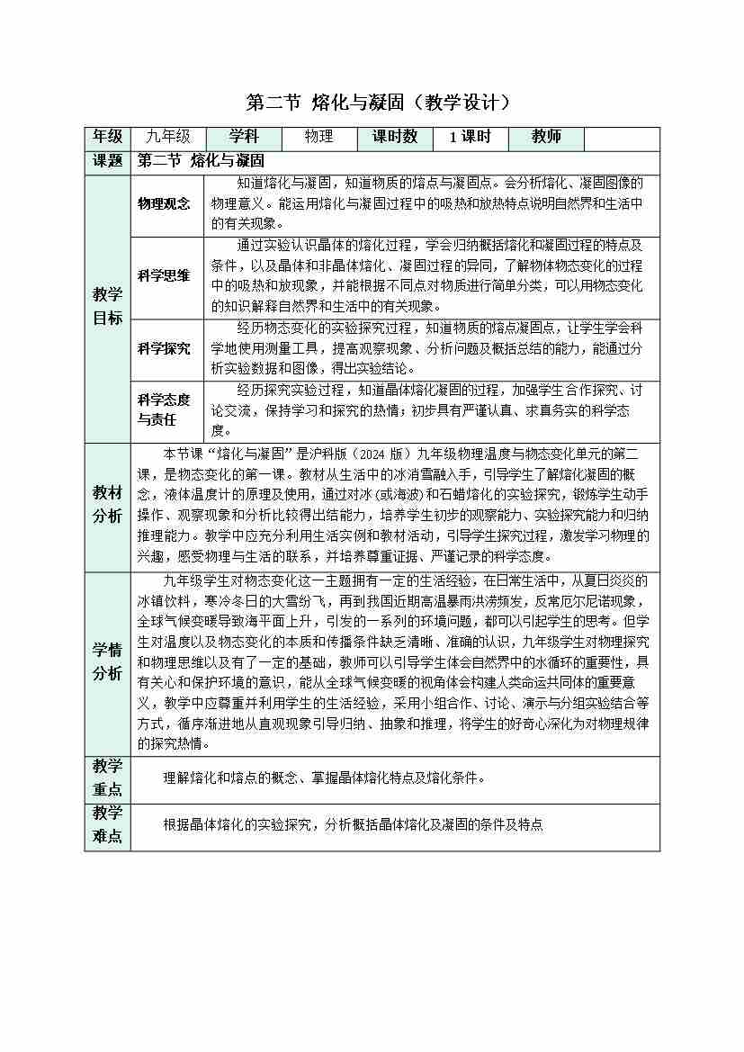 第二节 熔化与凝固(教学设计)物理沪科版2024九年级全一册
