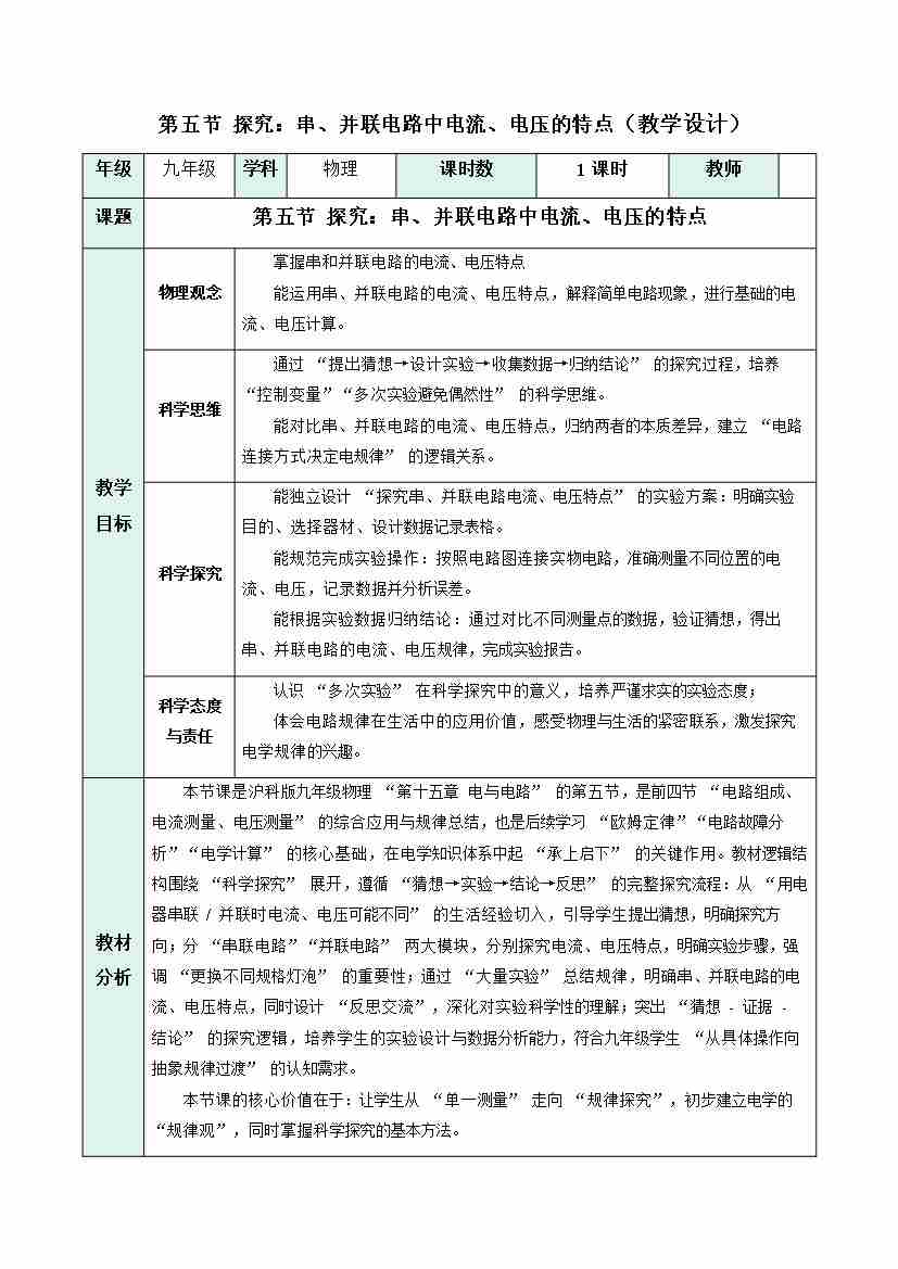 第五节 探究:串、并联电路中电流、电压的特点(教学设计)物理沪科版2024九年级全一册
