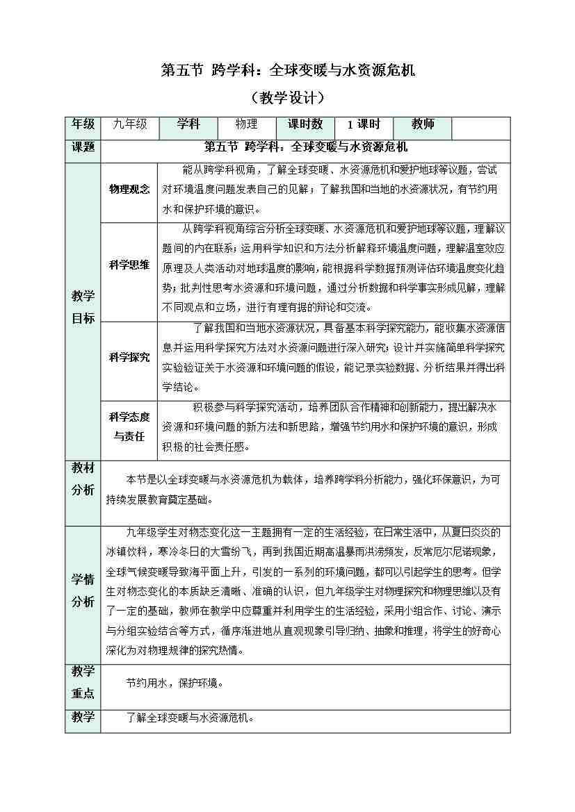 第五节 跨学科:全球变暖与水资源危机(教学设计)物理沪科版2024九年级全一册