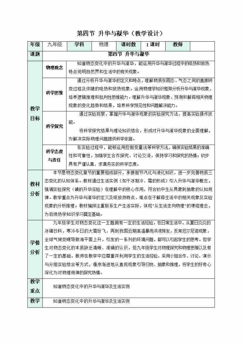 第四节 升华与凝华(教学设计)物理沪科版2024九年级全一册