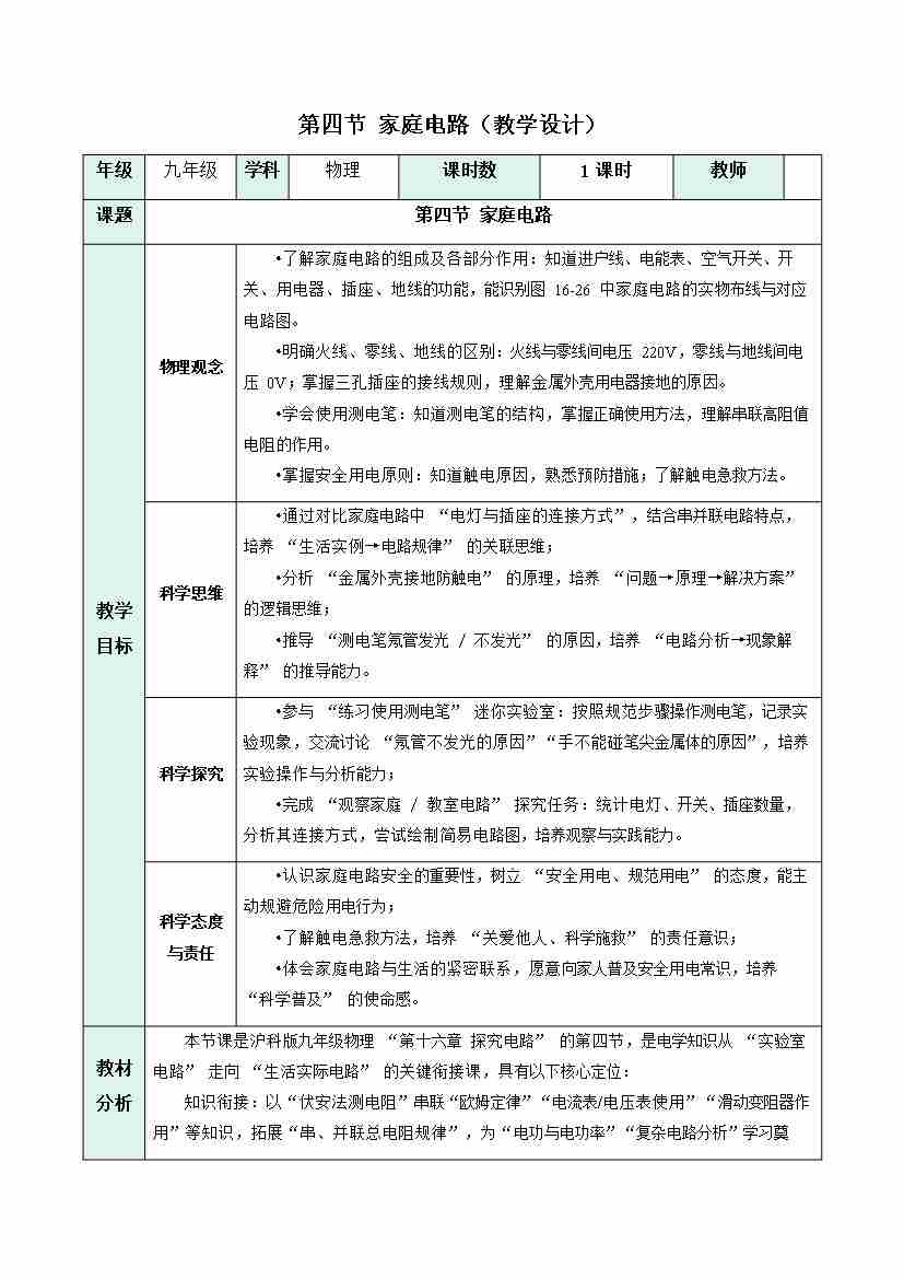 第四节 家庭电路(表格式教学设计)物理沪科版2024九年级全一册