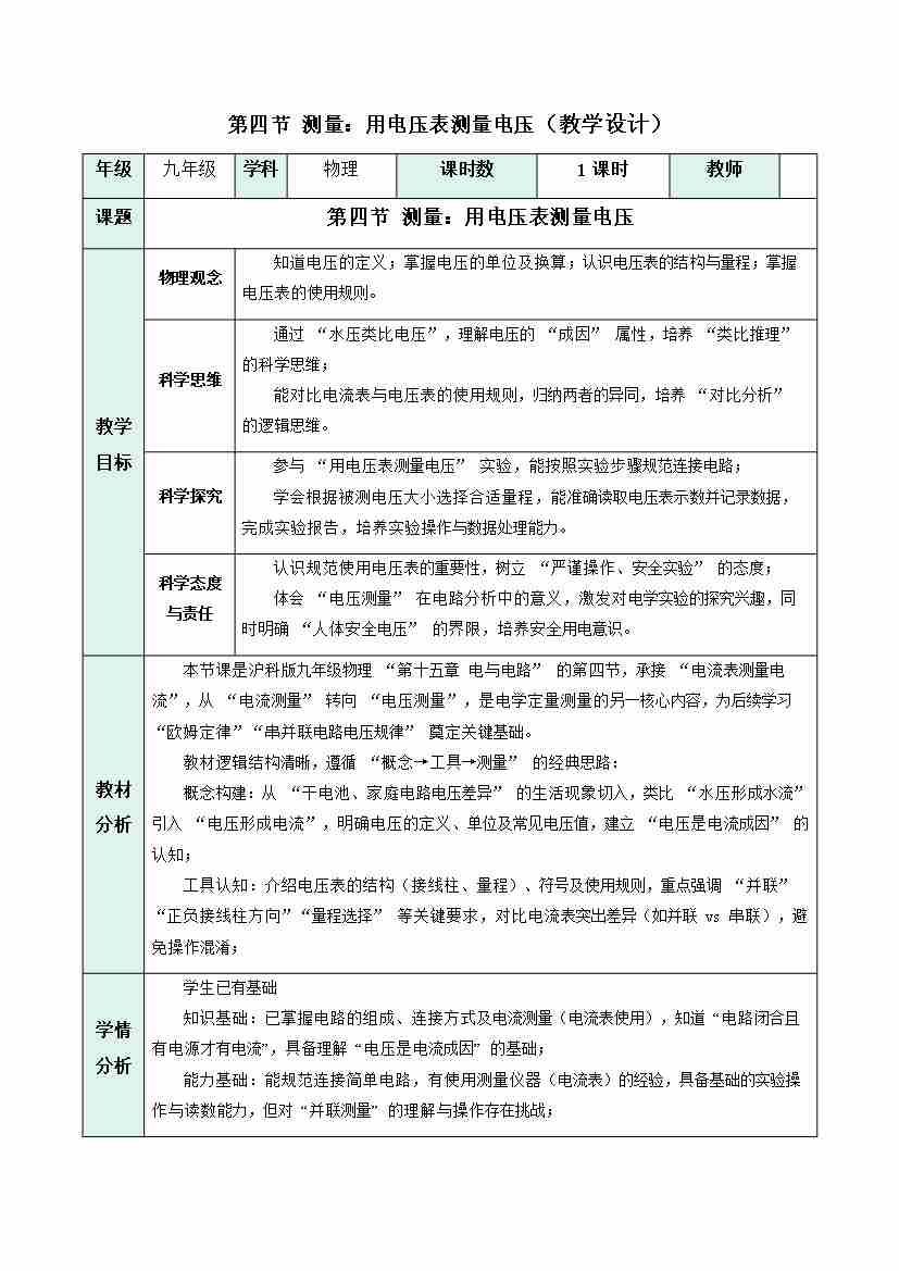 第四节 测量:用电压表测量电压(教学设计)物理沪科版2024九年级全一册