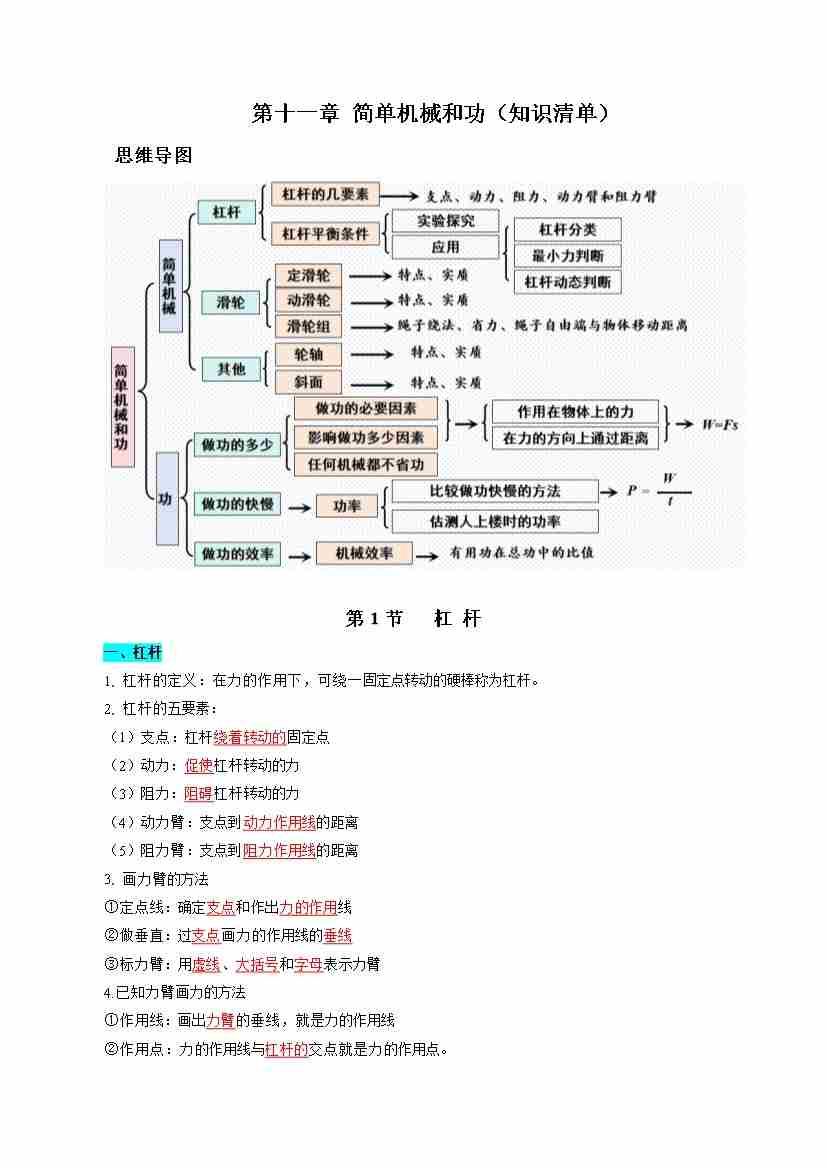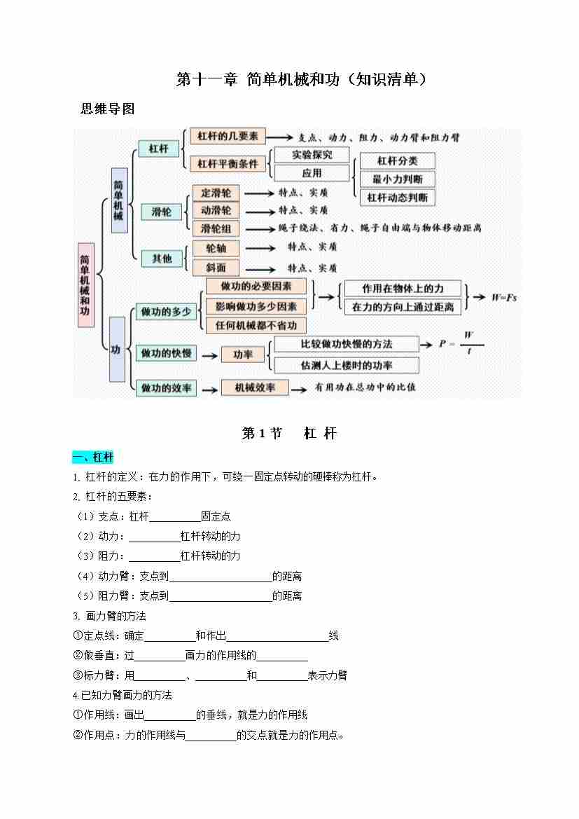 第十一章 简单机械和功(知识清单)(挖空版)
