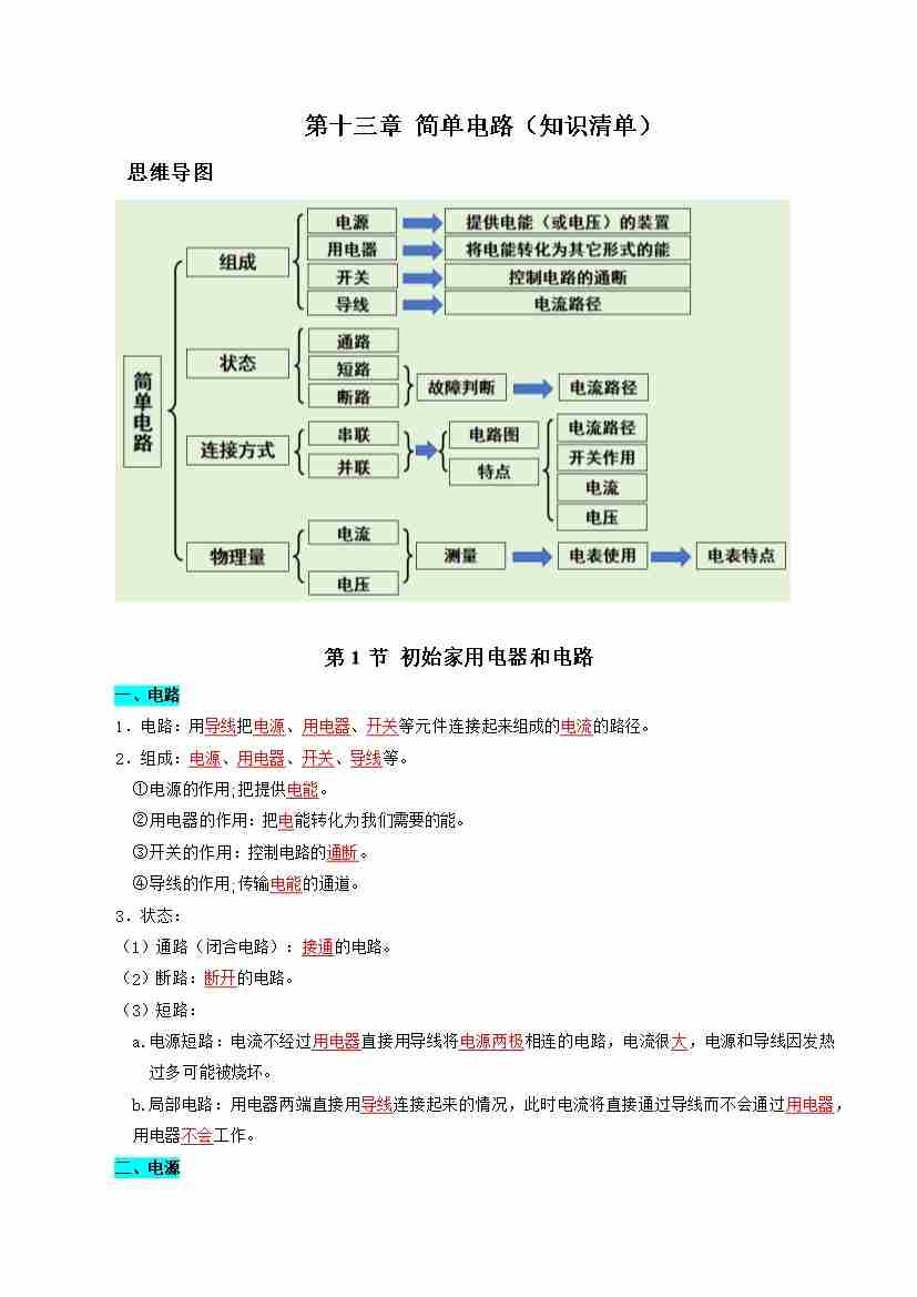 第十三章 简单电路(知识清单)(答案版)