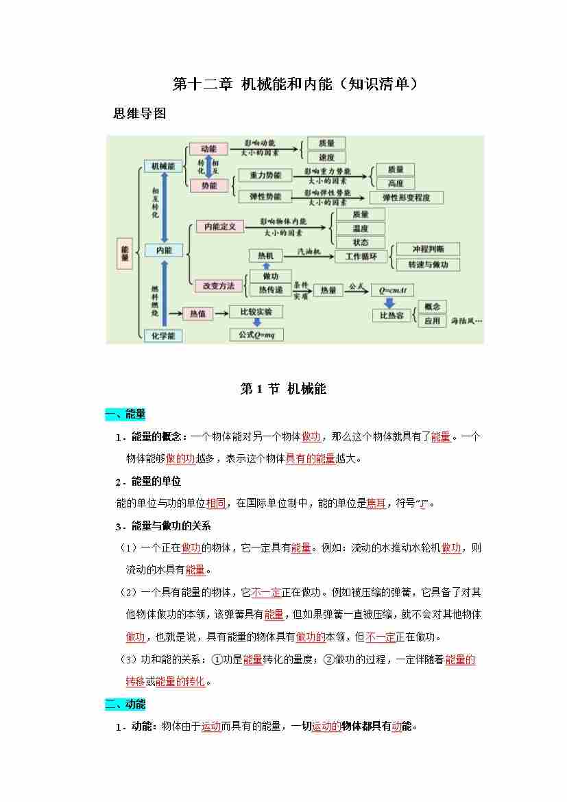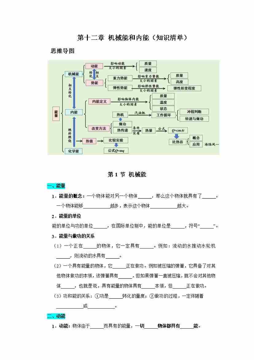 第十二章 机械能和内能(知识清单)(挖空版)