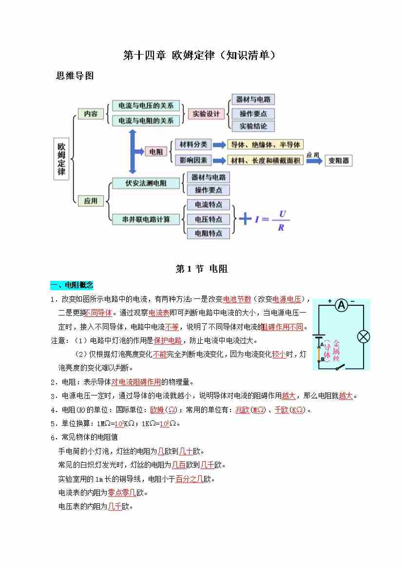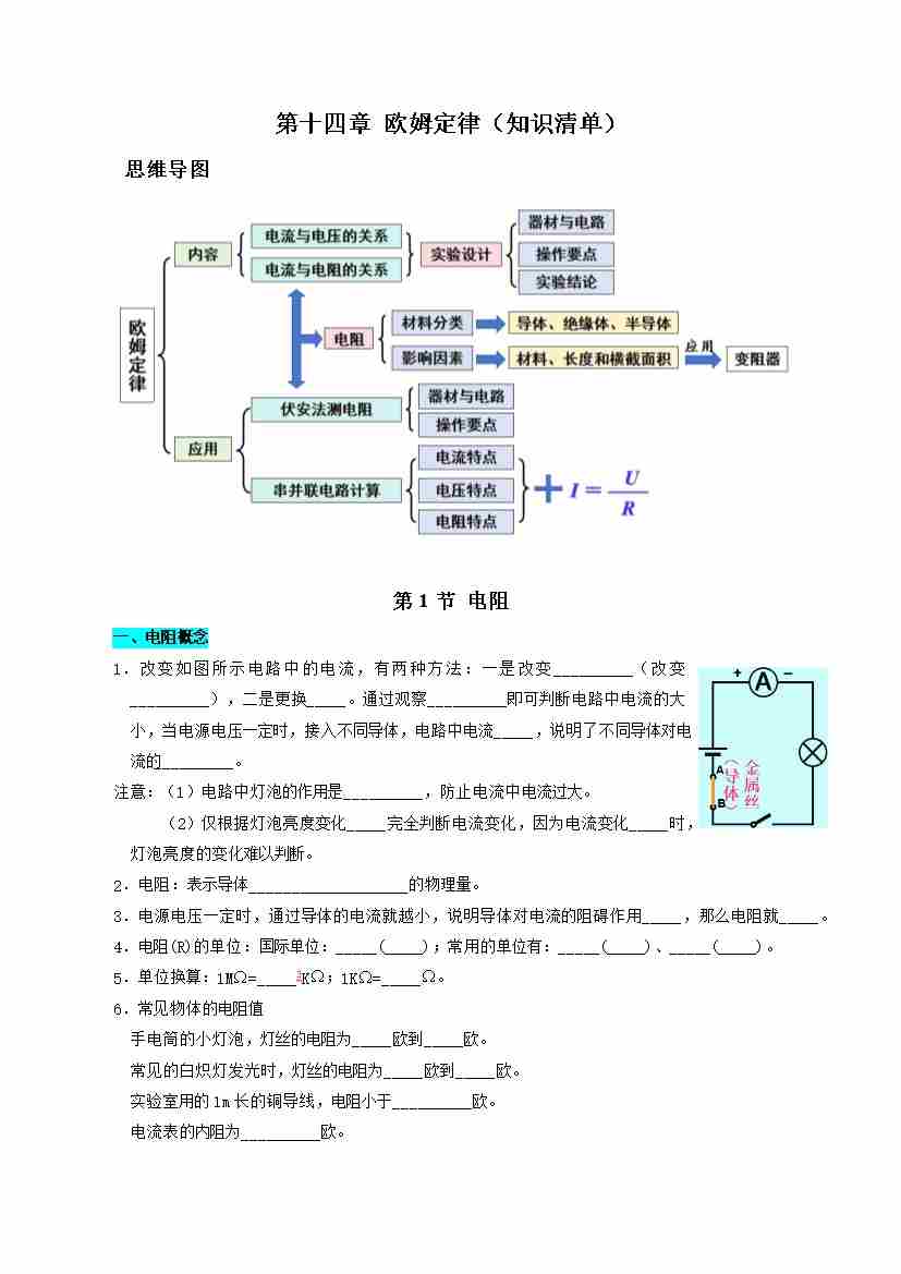 第十四章 欧姆定律(知识清单)(挖空版)