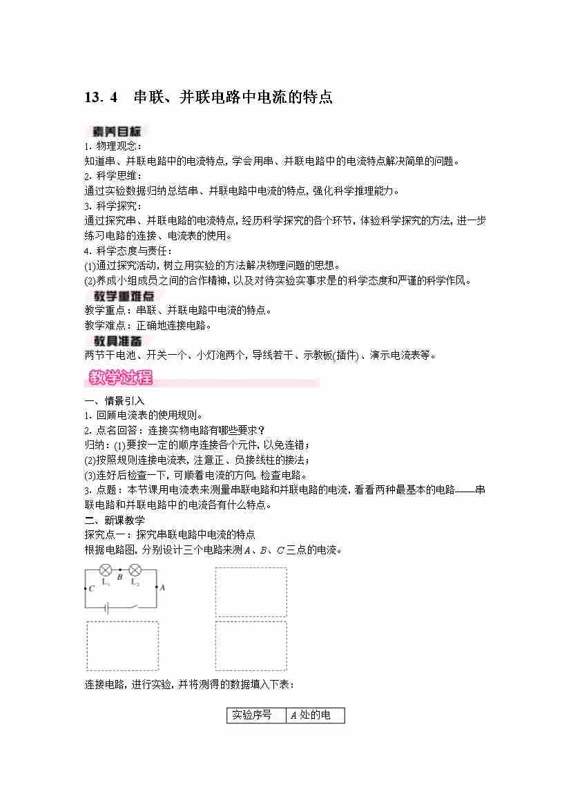 13.4 串联、并联电路中电流的特点