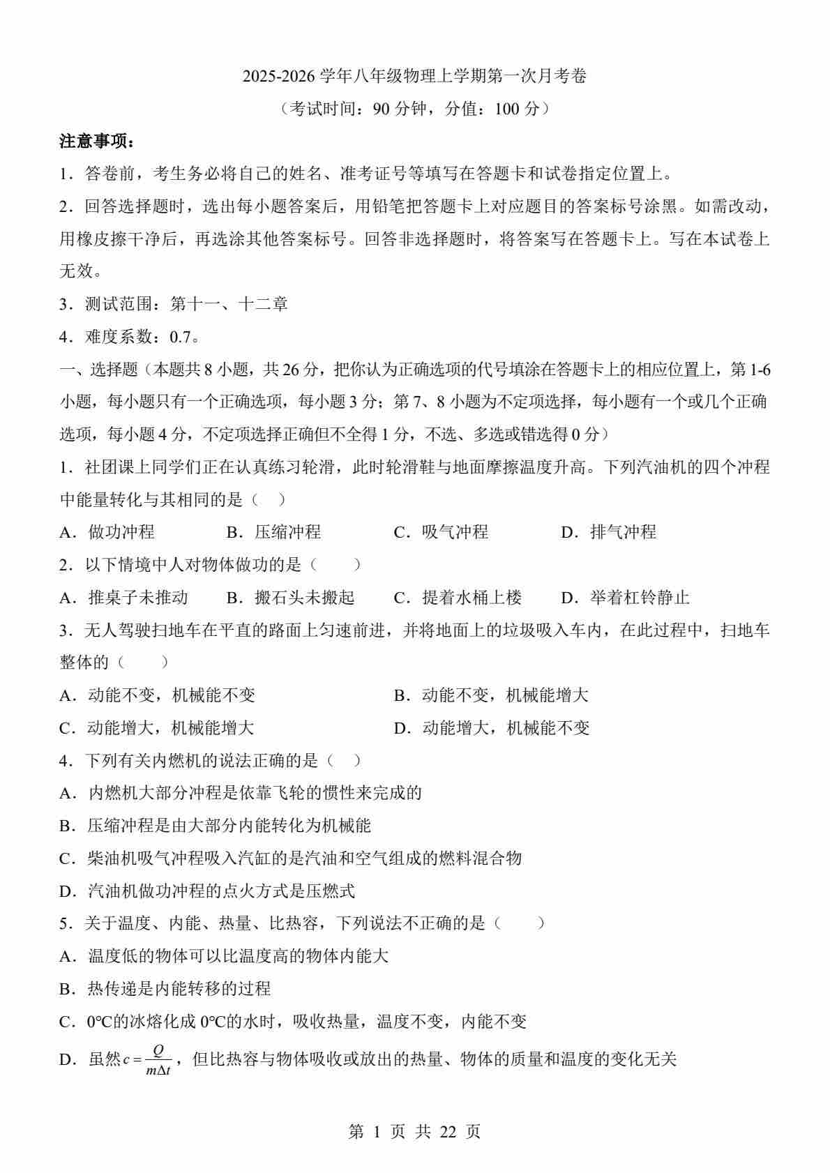 【沪粤】9上物理第1次月考【第11-12章】