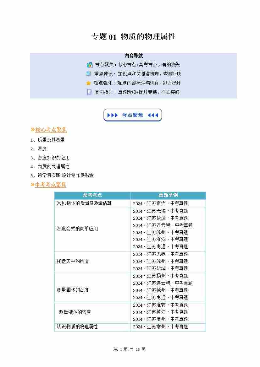 【苏科】专题01:物质的物理属性(复习)(原卷版)