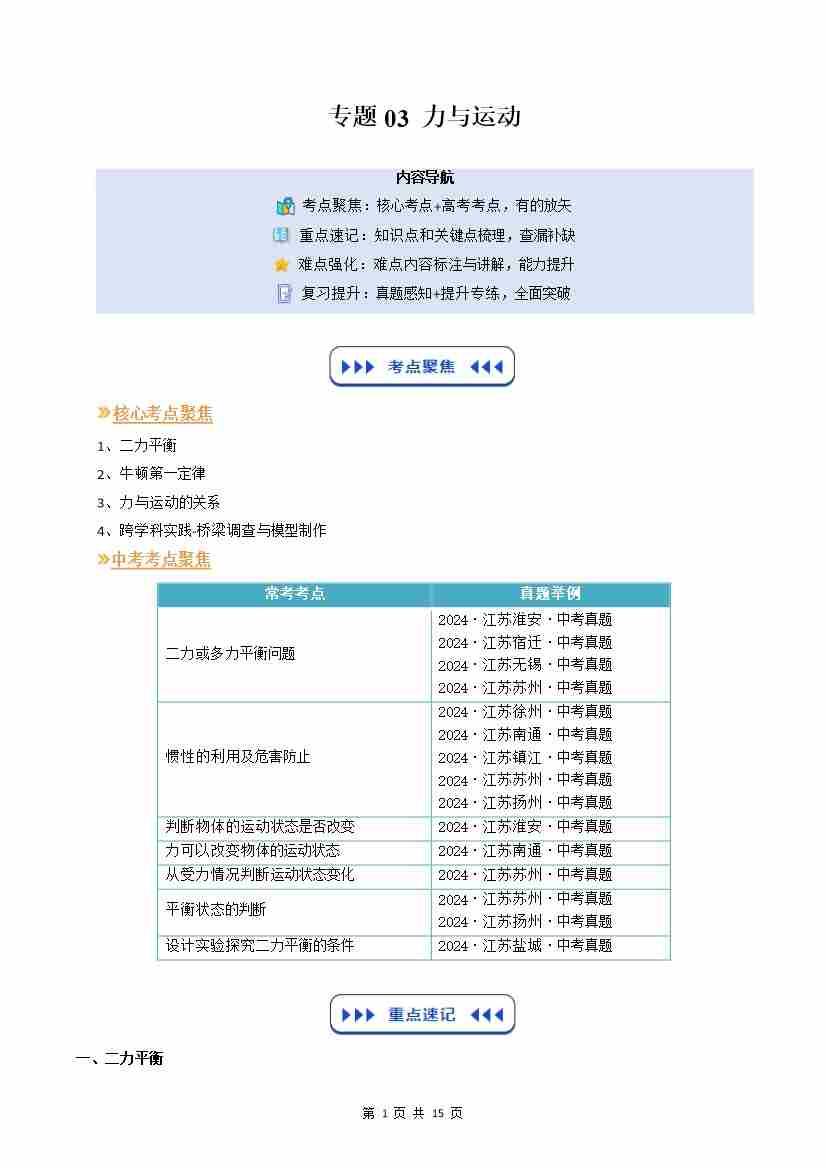 【苏科】专题03:力与运动(复习)(原卷版)
