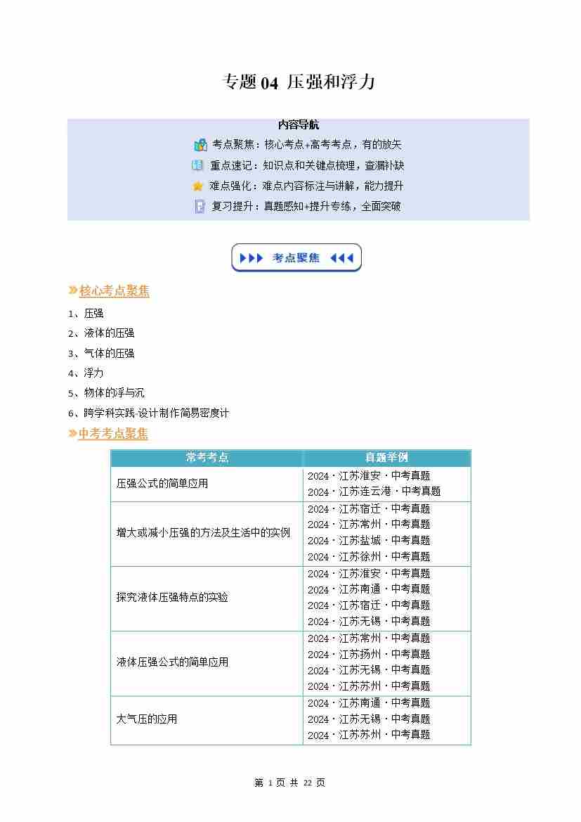 【苏科】专题04:压强和浮力(复习)(原卷版)