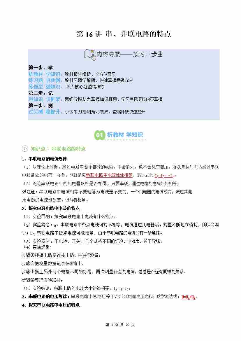 【苏科】第16讲:串、并联电路的特点(预习)(原卷版)