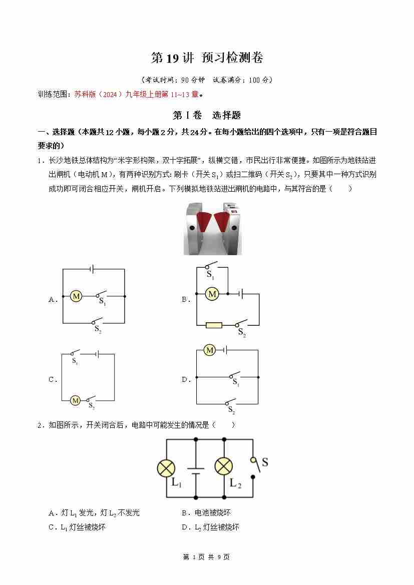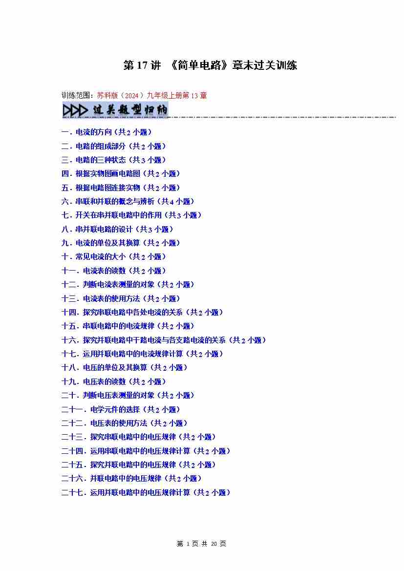【苏科】第17讲:《简单电路》章末过关训练(预习)(原卷版)