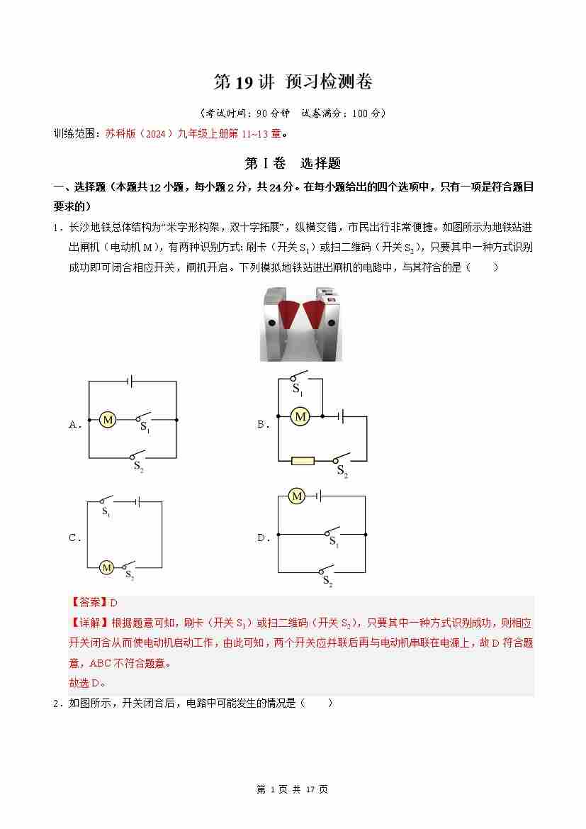 【苏科】第17讲:《简单电路》章末过关训练(预习)(解析版)