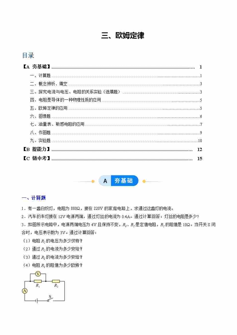 三、欧姆定律(分层作业)(原卷版)