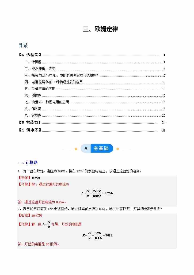 三、欧姆定律(分层作业)(解析版)