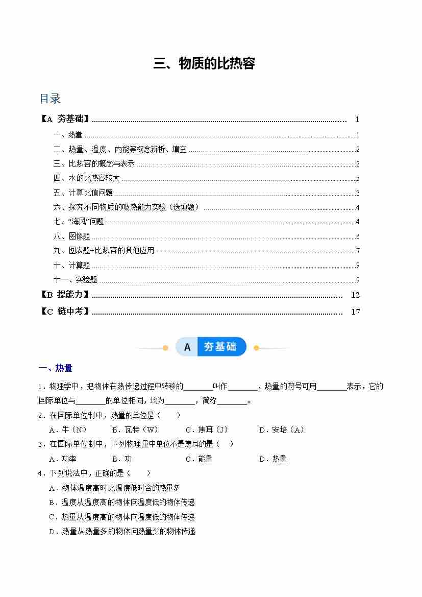 三、物质的比热容(分层作业)(原卷版)