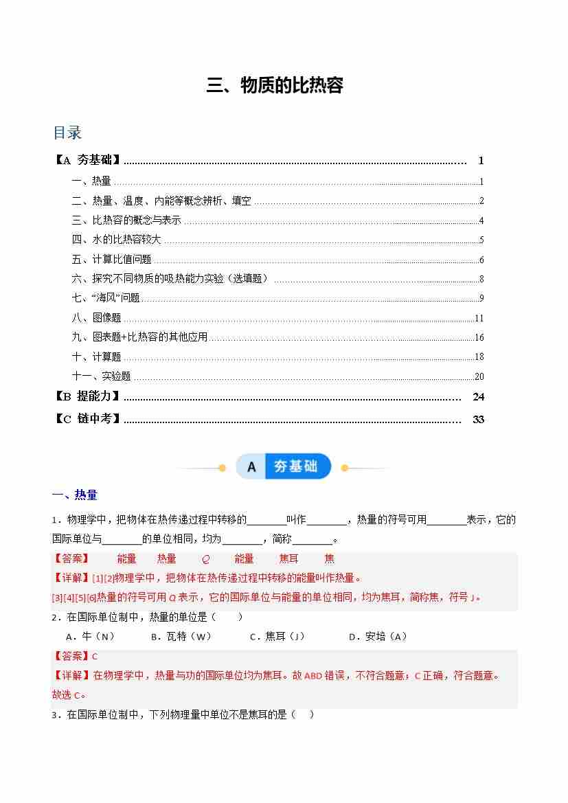 三、物质的比热容(分层作业)(解析版)
