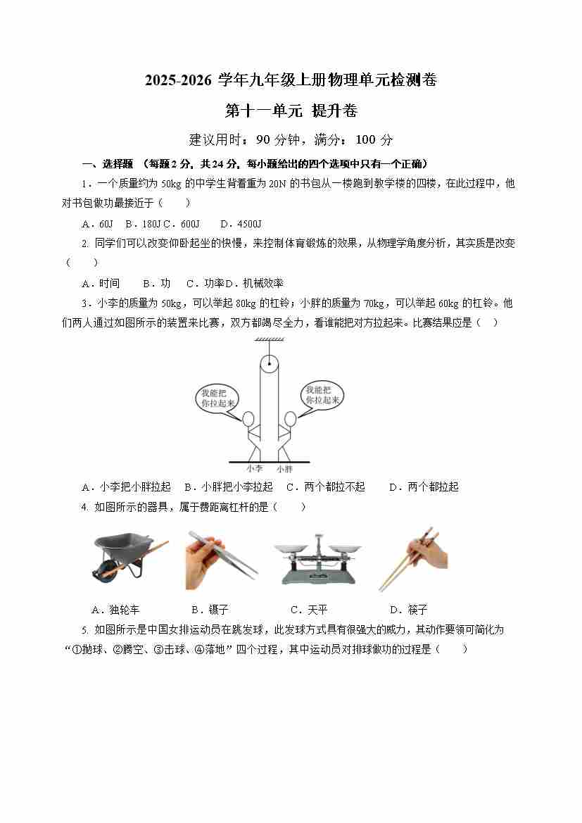 九上物理第十一单元测试 提升卷(考试版A4)