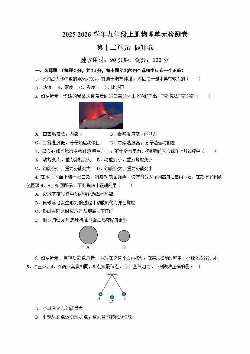 九上物理第十二单元测试 提升卷(考试版A4)