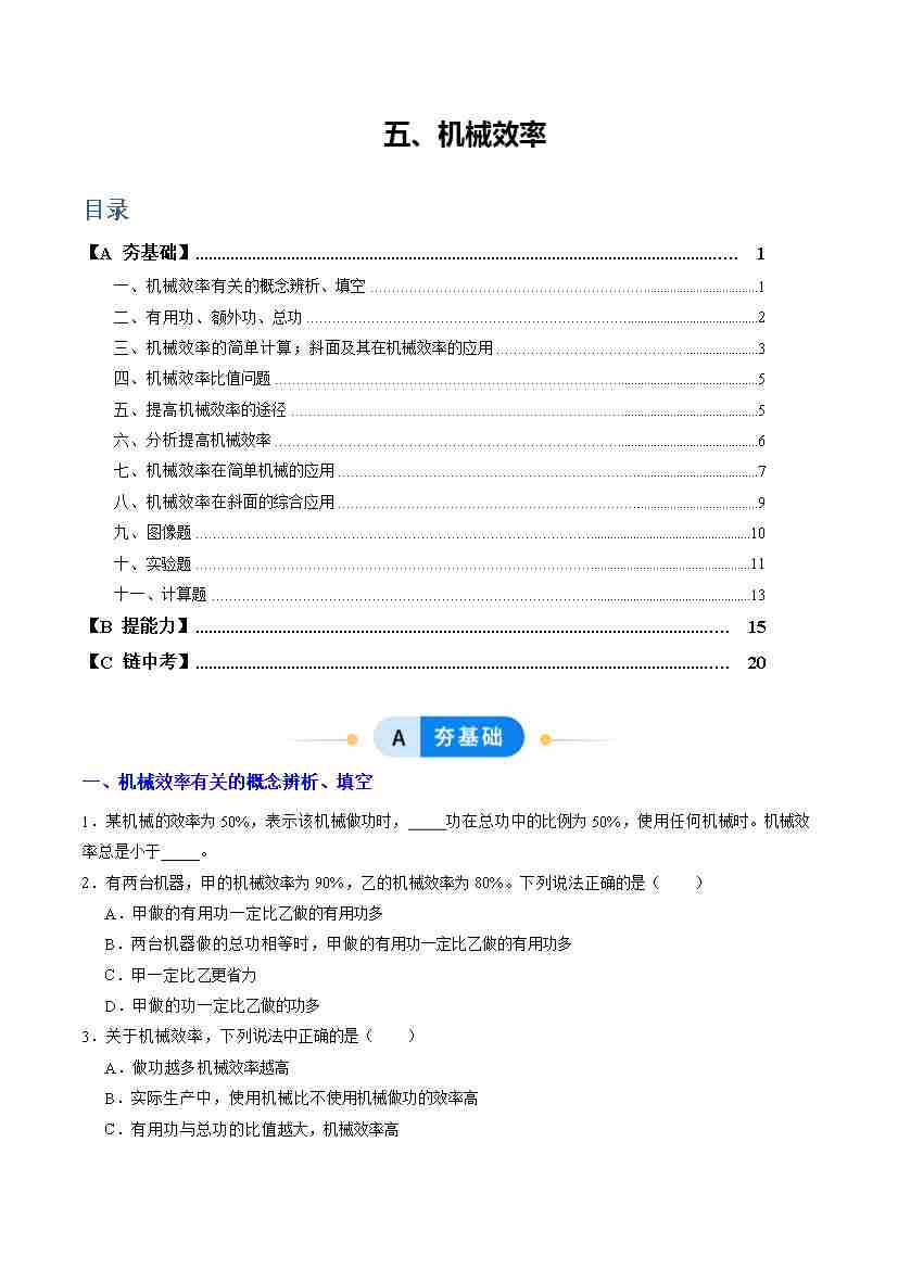 五、机械效率(分层作业)(原卷版)