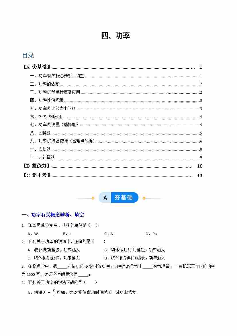 四、功率(分层作业)(原卷版)
