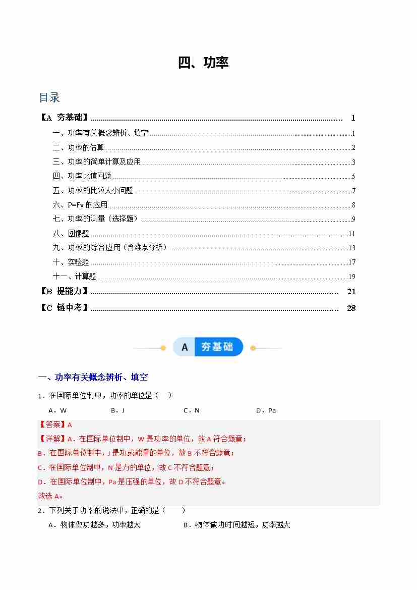 四、功率(分层作业)(解析版)