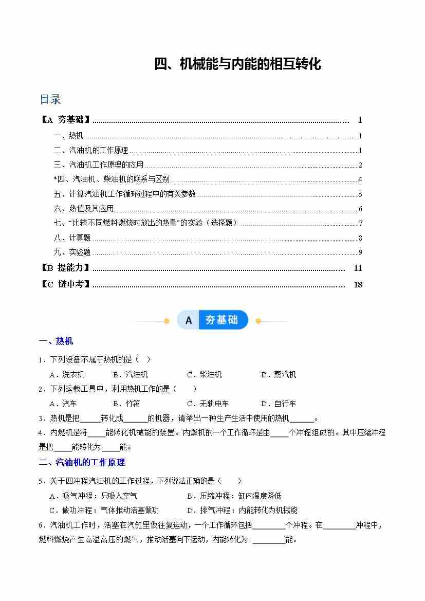 四、机械能与内能的相互转化(分层作业)(原卷版)