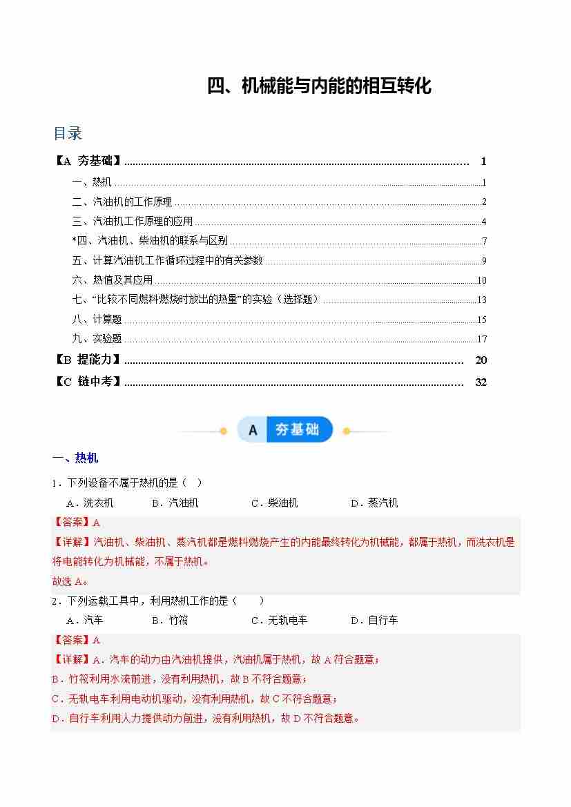 四、机械能与内能的相互转化(分层作业)(解析版)