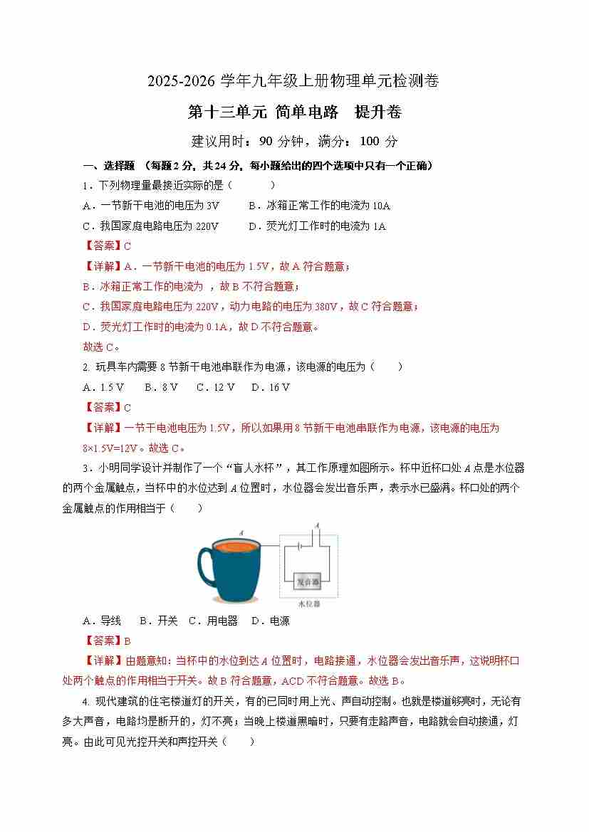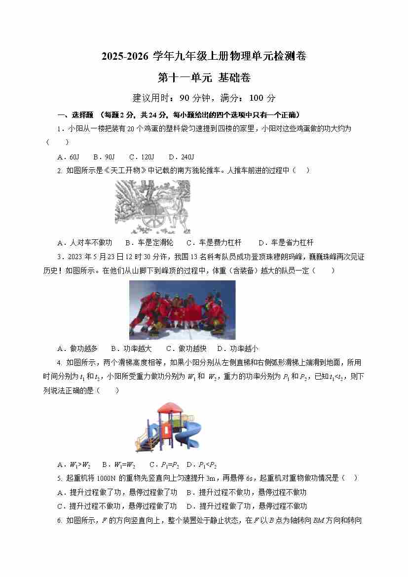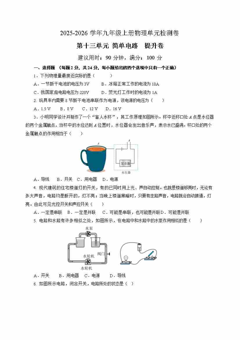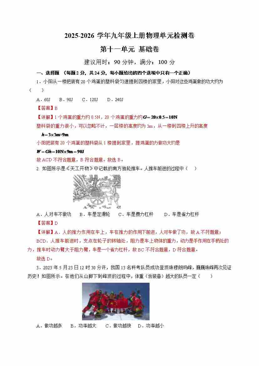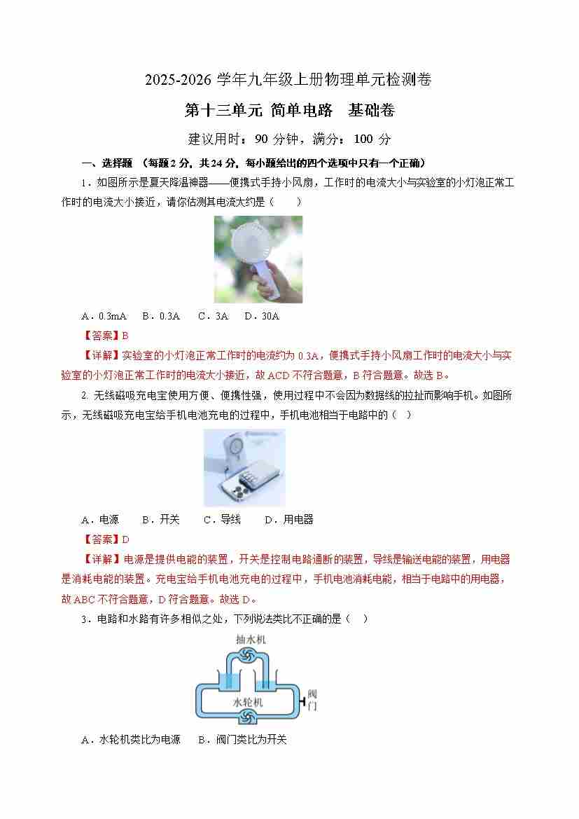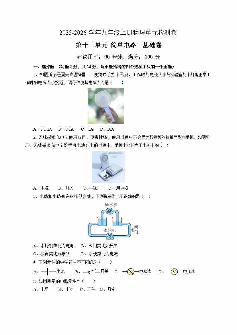 九上物理第十一单元测试 基础卷(考试版A4)