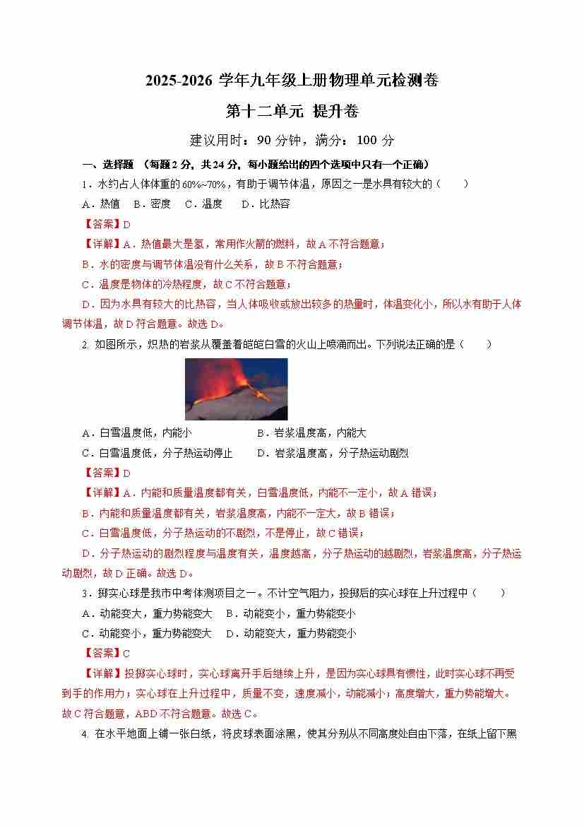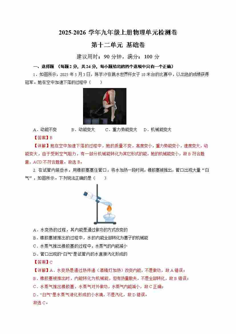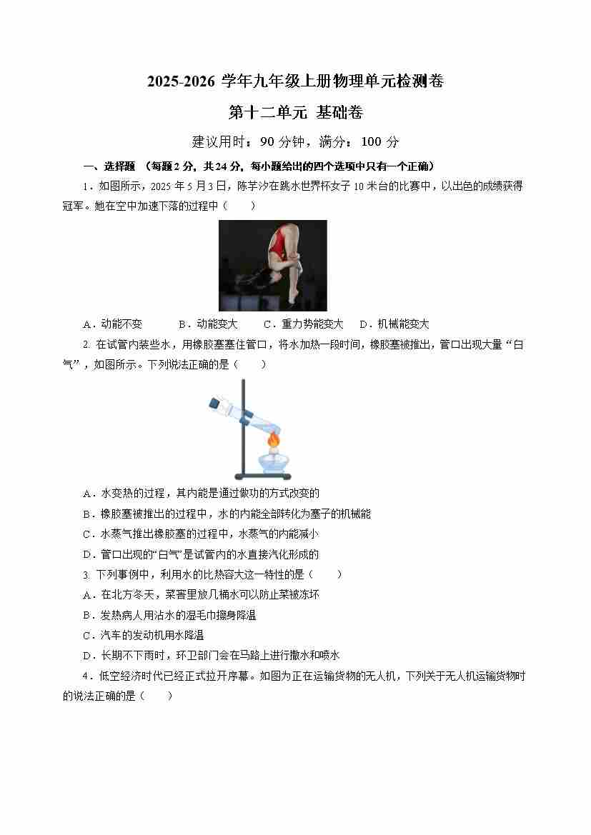 九上物理第十二单元测试 基础卷(考试版A4)
