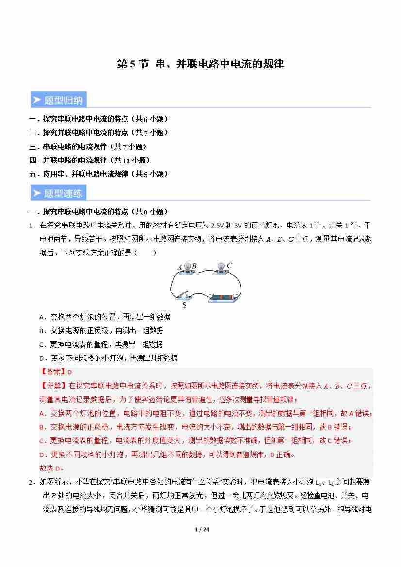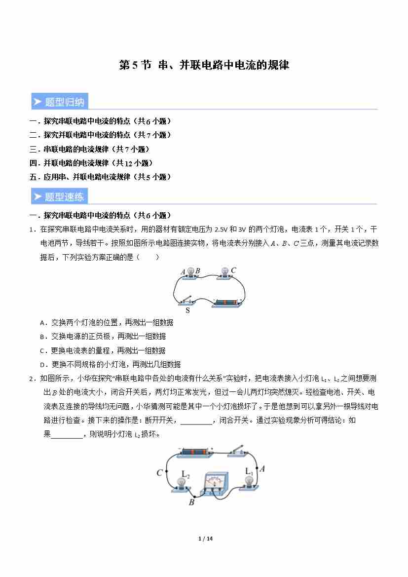第5节 串、并联电路中电流的规律(重难点训练)(原卷版)