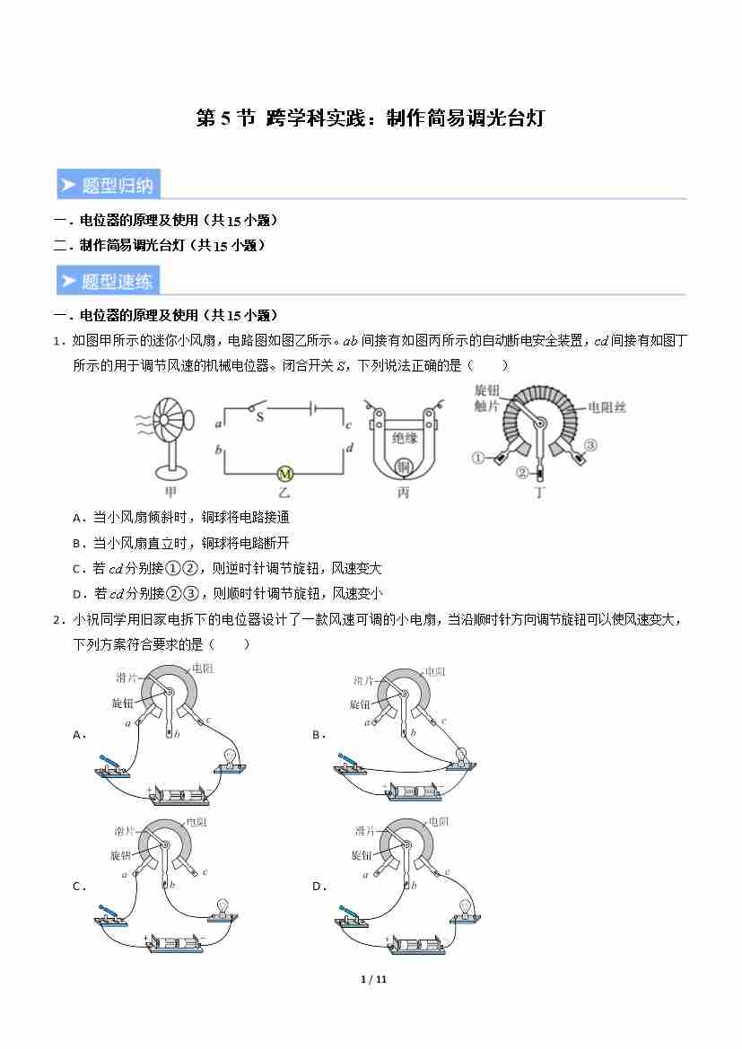 第5节 跨学科实践:制作简易调光台灯(重难点训练)(原卷版)