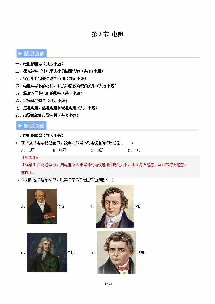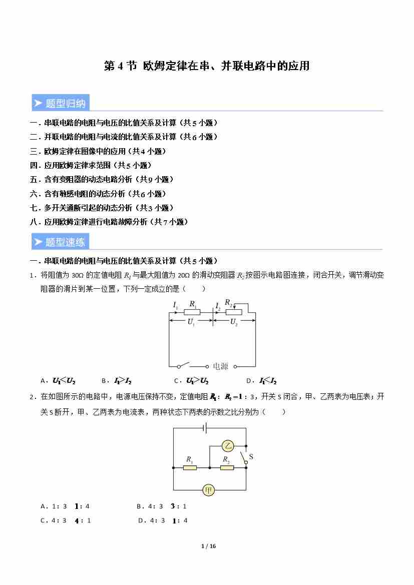 第4节 欧姆定律在串、并联电路中的应用(重难点训练)(原卷版)