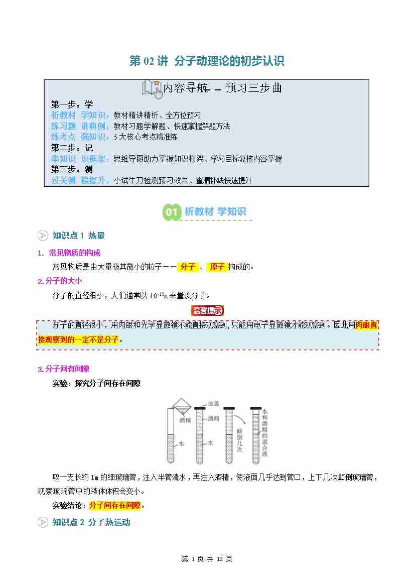 第02讲: 分子动理论的初步认识(预习)(原卷版)