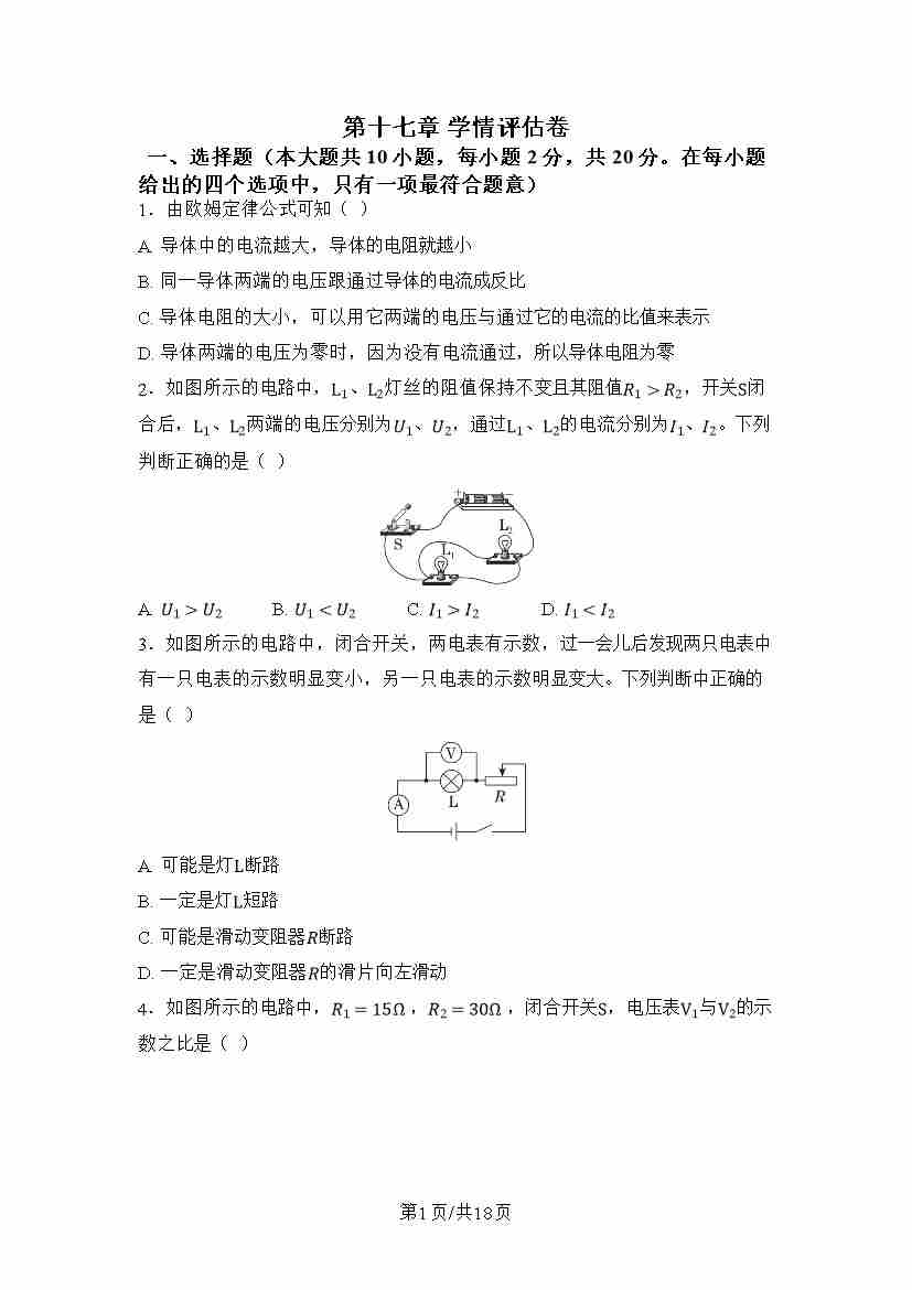 第十七章 欧姆定律 学情评估卷(含答案)2025-2026学年人教九年级物理全册