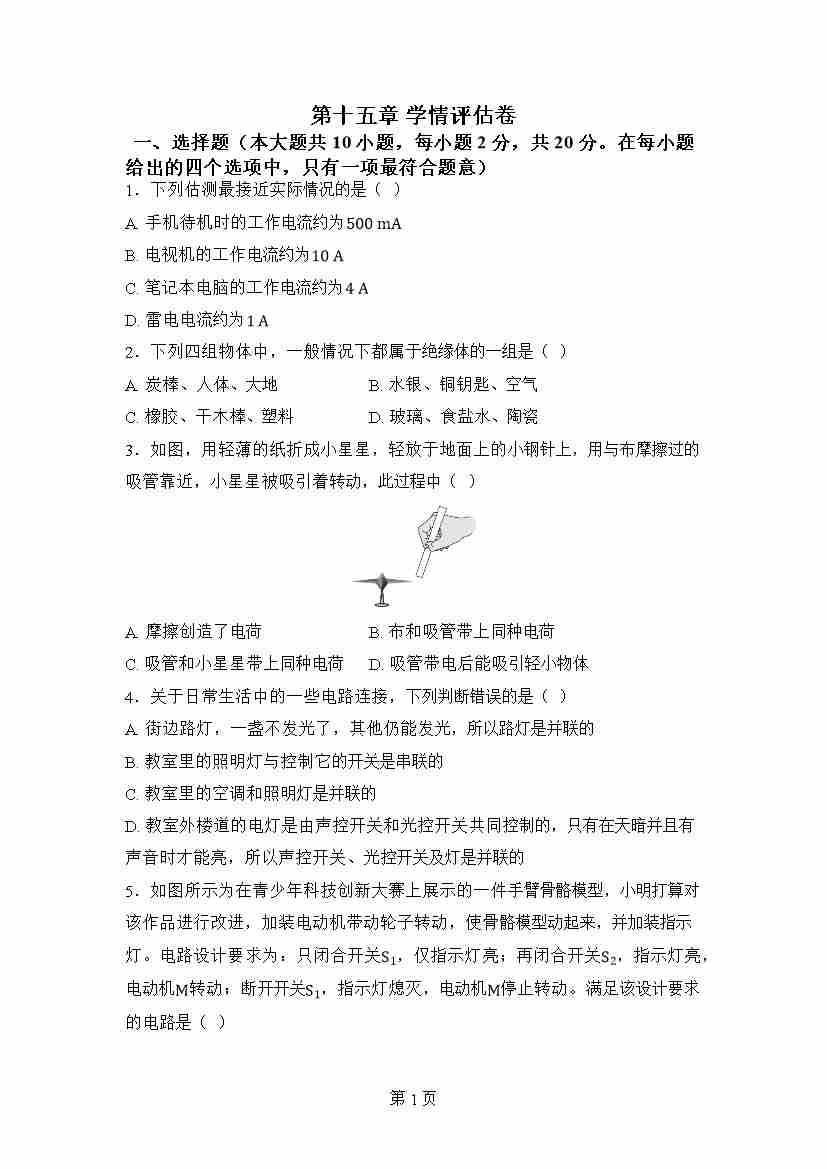 第十五章 电流和电路 学情评估卷(含答案)2025-2026学年人教九年级物理全册