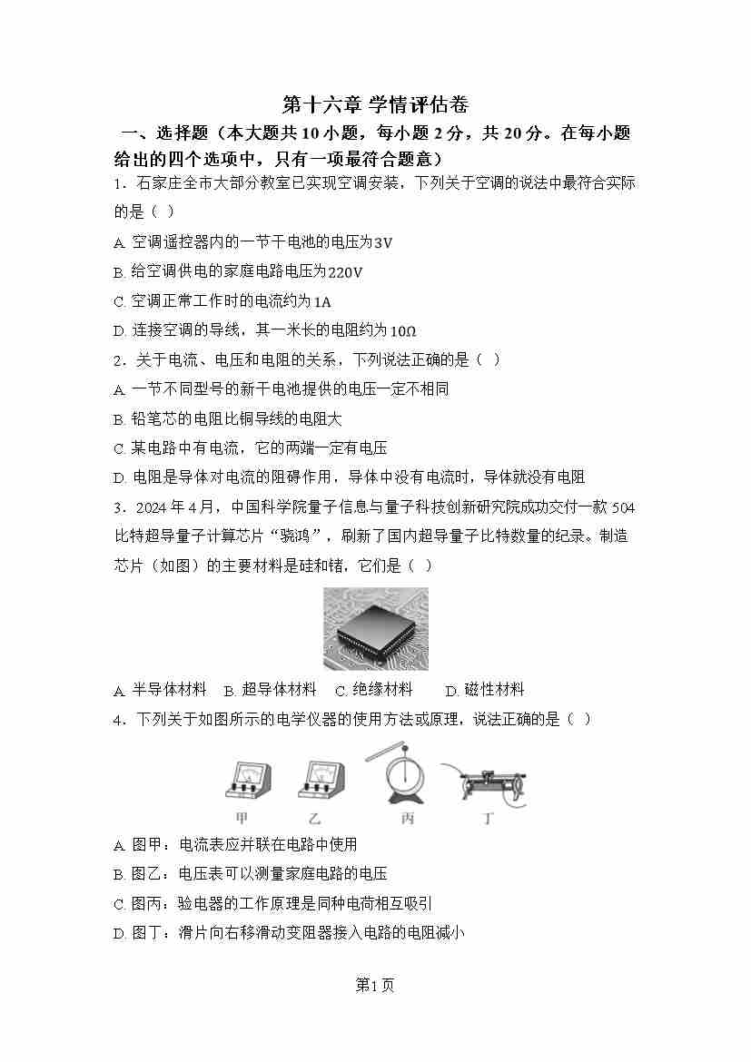 第十六章 电压 电阻 学情评估卷(含答案)2025-2026学年人教九年级物理全册