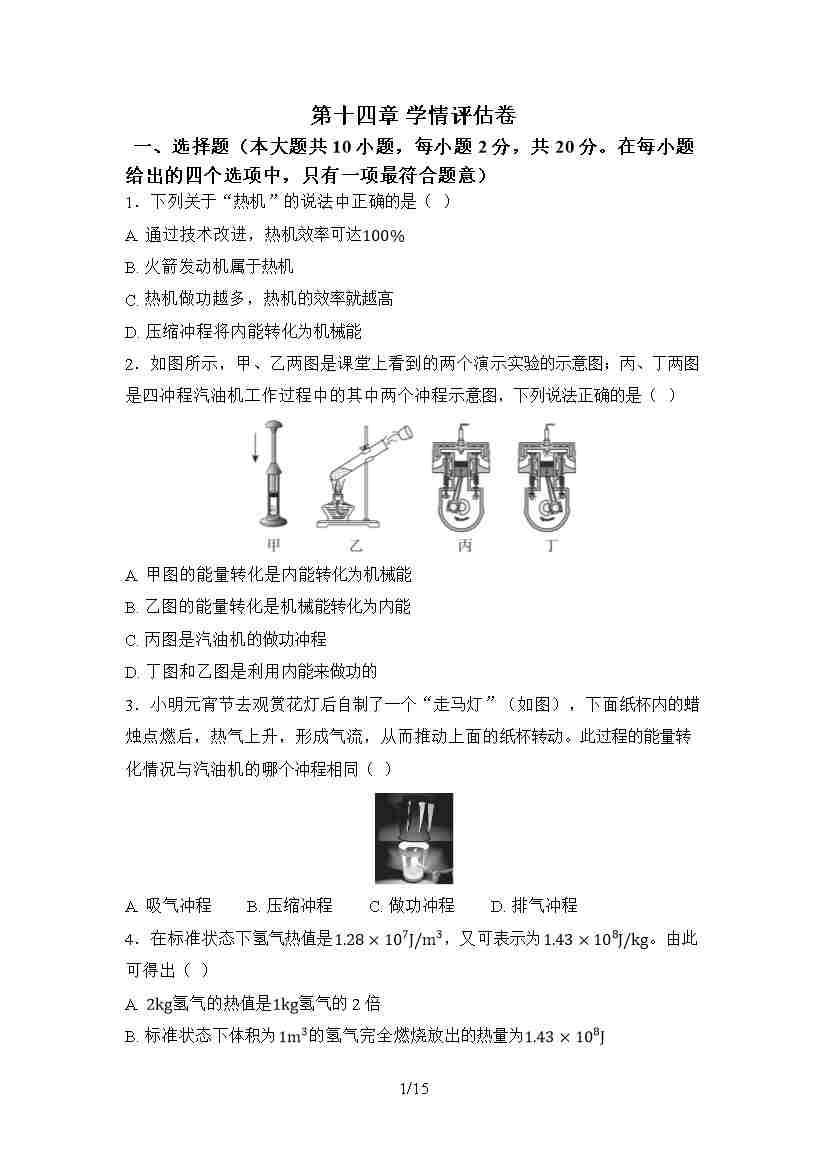 第十四章 内能的利用 学情评估卷(含答案)2025-2026学年人教九年级物理全册