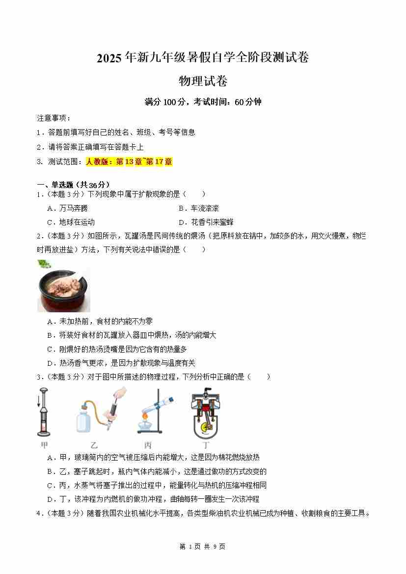 暑假全阶段测试卷【测试范围:第13~17章(人教版)】(原卷版)