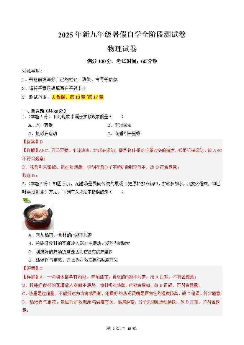 暑假全阶段测试卷【测试范围:第13~17章(人教版)】(解析版)