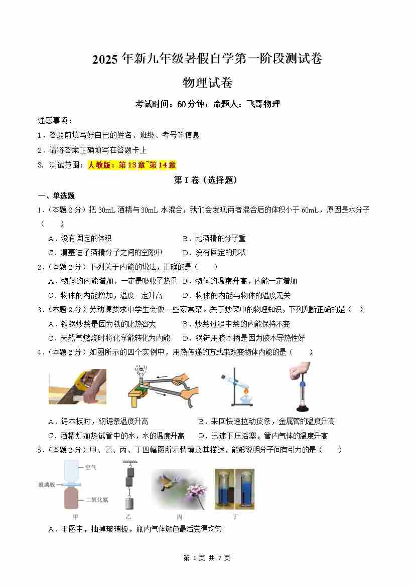 暑假第一阶段测试卷【测试范围:第13~14章(人教版)】(原卷版)