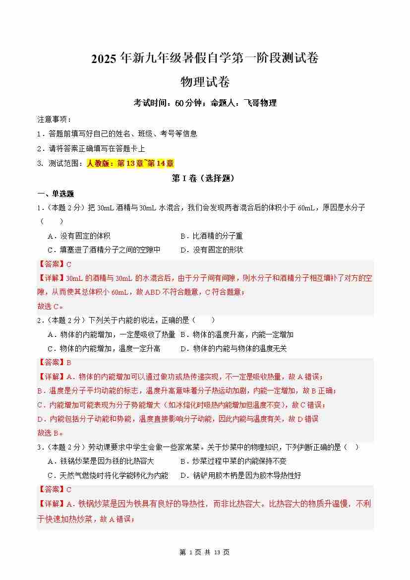 暑假第一阶段测试卷【测试范围:第13~14章(人教版)】(解析版)