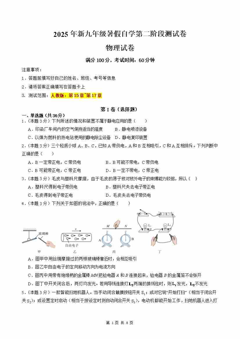 暑假第二阶段测试卷【测试范围:第15~17章(人教版)】(原卷版)