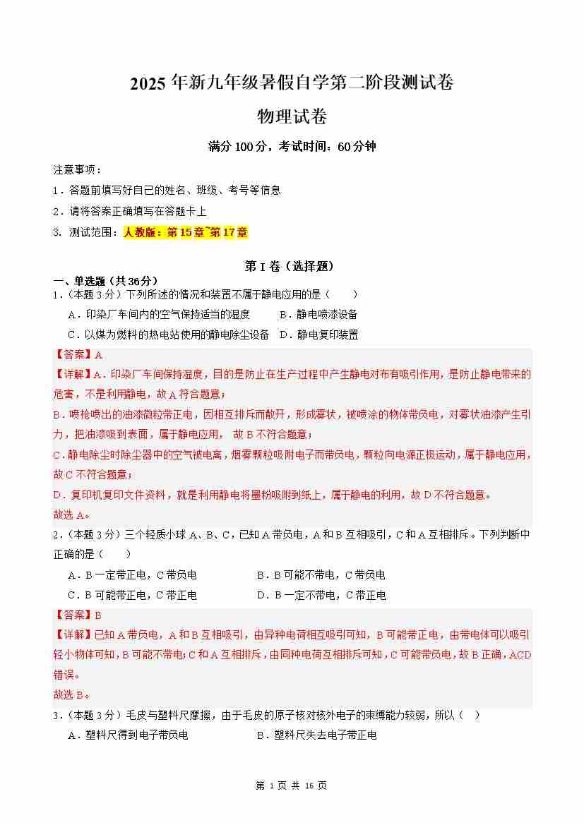 暑假第二阶段测试卷【测试范围:第15~17章(人教版)】(解析版)