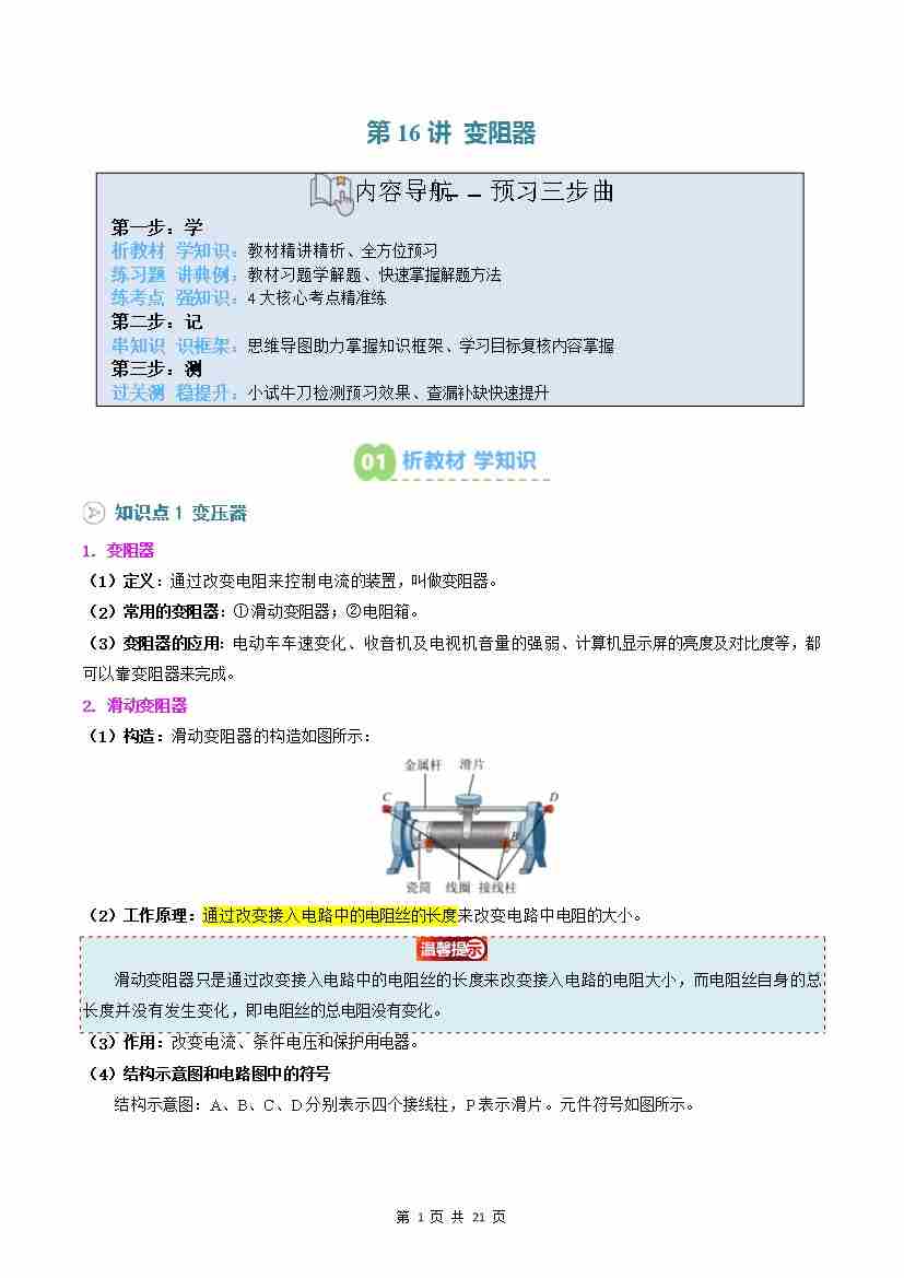 第17讲: 电流与电压、电阻的关系(预习)(解析版)
