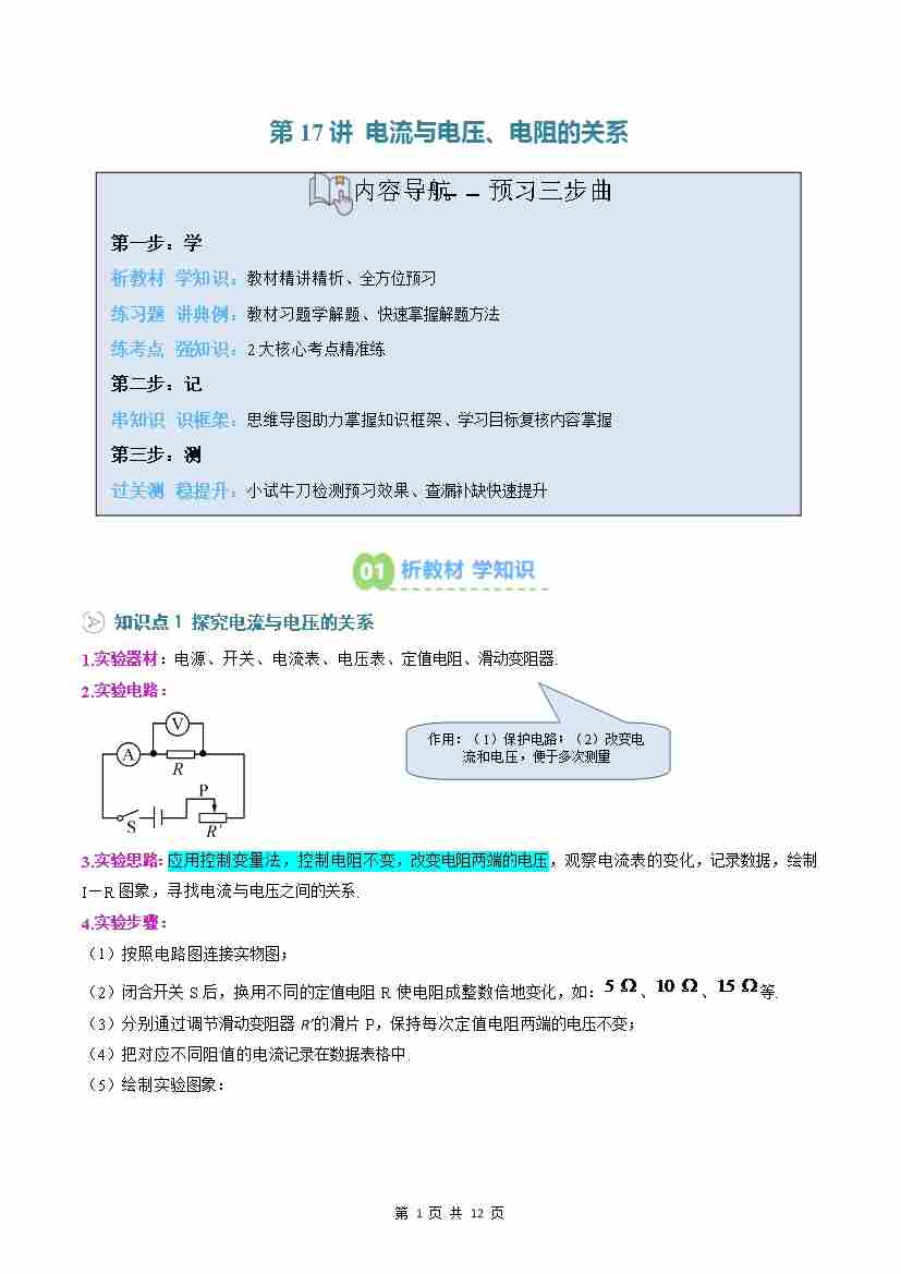 第17讲: 电流与电压、电阻的关系(预习)(原卷版)
